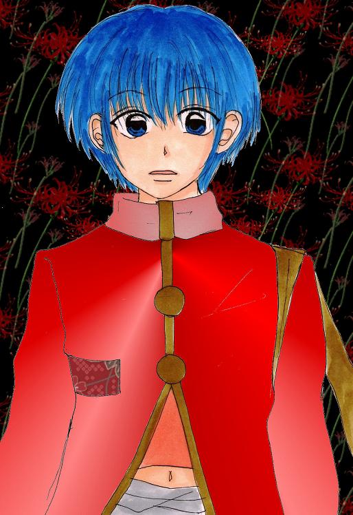 青い髪と、赤い装束になっております。